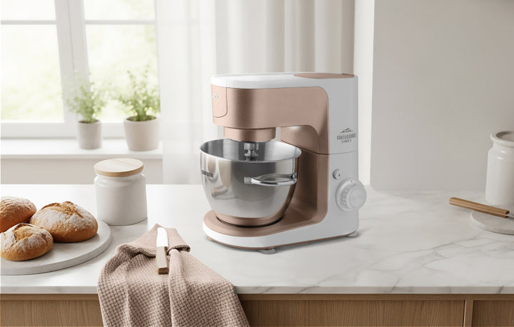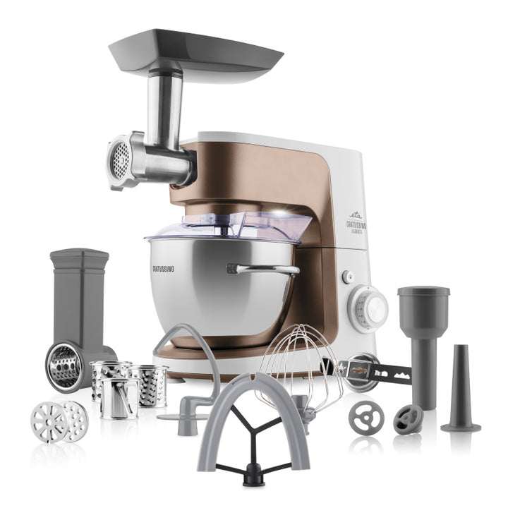 Příslušenství v balení: bubínkové struhadlo, flexi metla, hnětací hák, mlýnek na maso, průhledný kryt mísy, šlehací metla