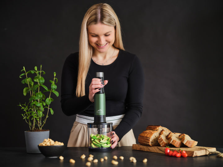 V balení najdete i praktický sekáček s ostrým srpovitým nožem, který snadno zvládne i tvrdší potraviny, jako jsou ořechy, zelenina nebo ovoce. Chcete si nasekat cibuli, bylinky nebo připravit domácí pesto? Žádný problém! Tento tyčový mixér ETA je připravený na všechny vaše kuchařské výzvy.